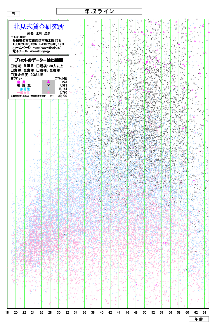 北見式賃金研究所は、中小企業に勤める数万人の賃金明細を集めました。それを基に各種の賃金グラフを作成し、ホームページ上にアップしました。