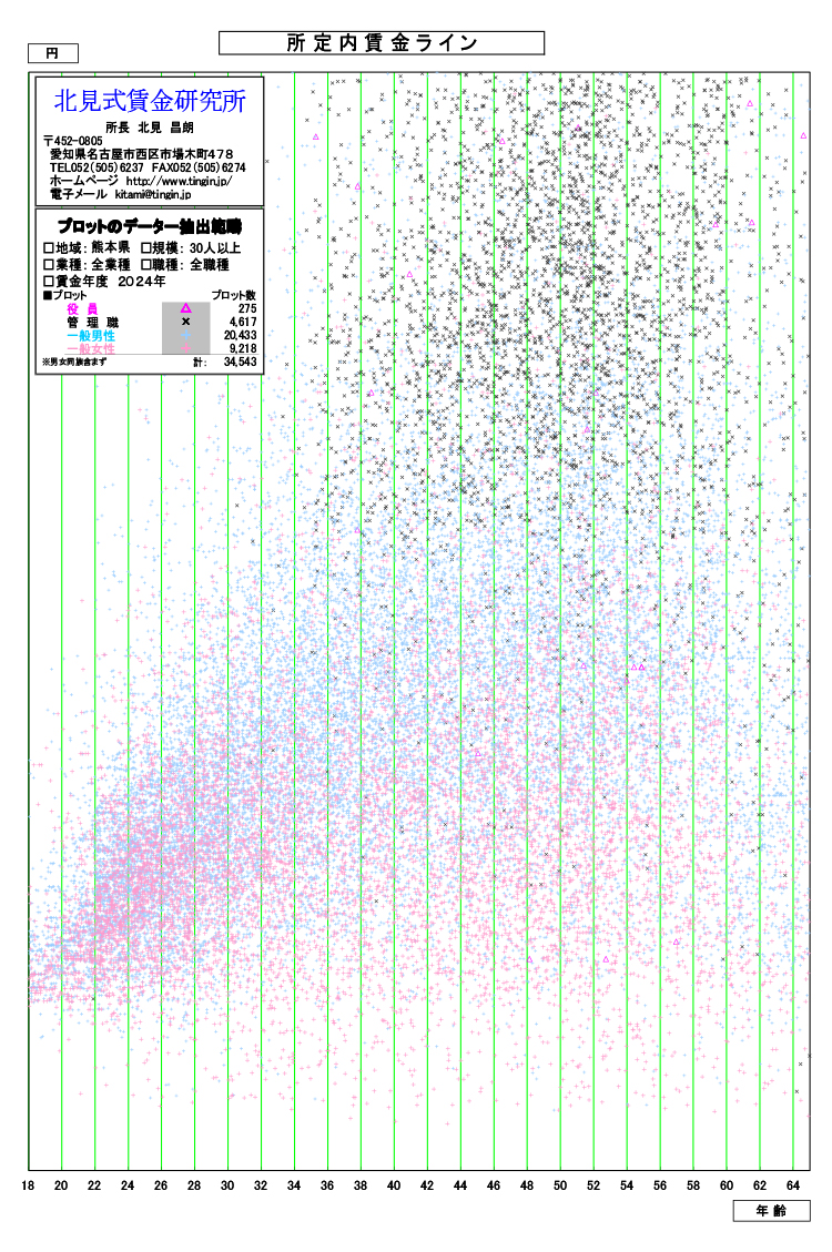 北見式賃金研究所は、中小企業に勤める数万人の賃金明細を集めました。それを基に各種の賃金グラフを作成し、ホームページ上にアップしました。