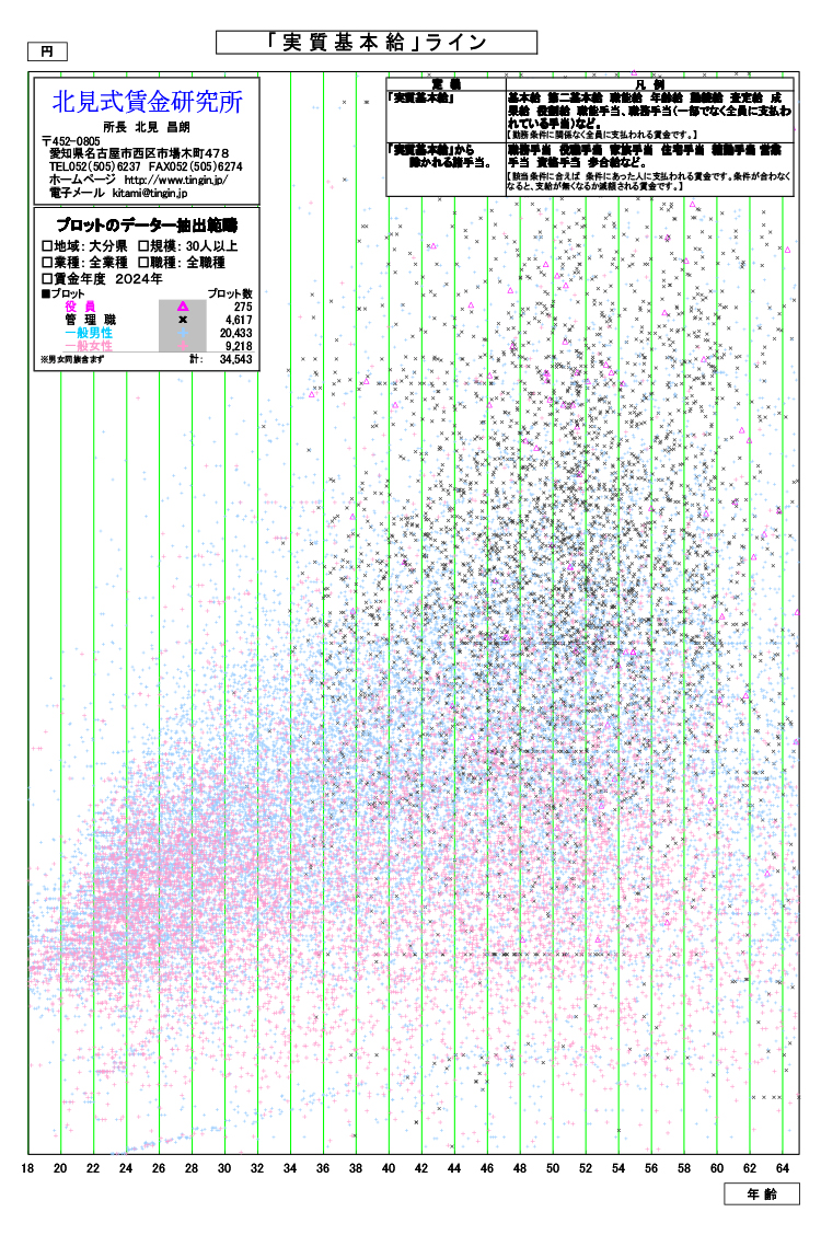 北見式賃金研究所は、中小企業に勤める数万人の賃金明細を集めました。それを基に各種の賃金グラフを作成し、ホームページ上にアップしました。